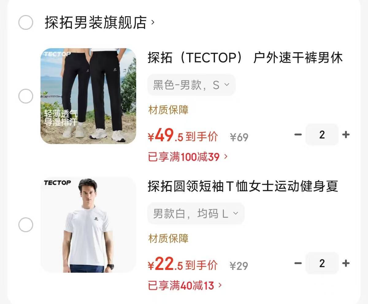 探拓速干裤/短袖:裤子任选2件99元,圆领短袖任选2件45元