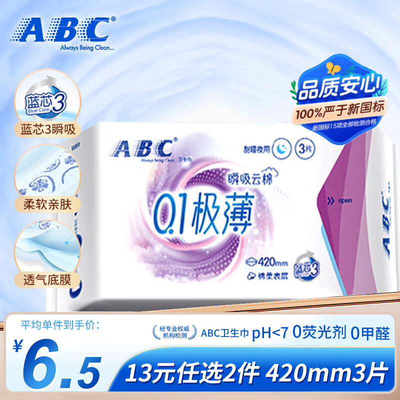 ABC卫生巾组合任选5件仅需20元 赠私护湿巾