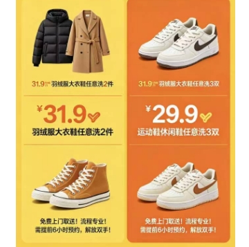 美团洗衣限时特惠:运动鞋/羽绒服任意洗2件仅需31.9元