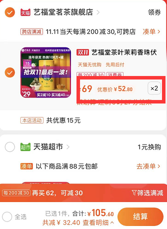 在售价69元,领5元券,产品页面价格下领99-15元券,拍2件实付105.6元包邮,折52.5元每件。