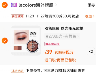 现售价39元,拍2件立减24元,领54-20优惠券,拍2件凑单叠加满300-30优惠,和凑单品一起付款,折合两件眼影31.5元左右到手;