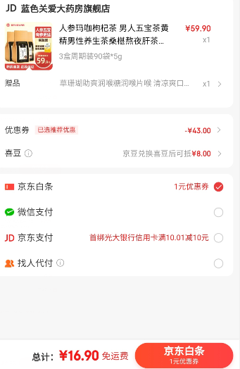 现售价59.9元,领40元券,叠加上方京喜3元全品券及1元白条支付券,京喜App下单选择白条付款,实付15.9元包邮,赠枇杷润喉糖;