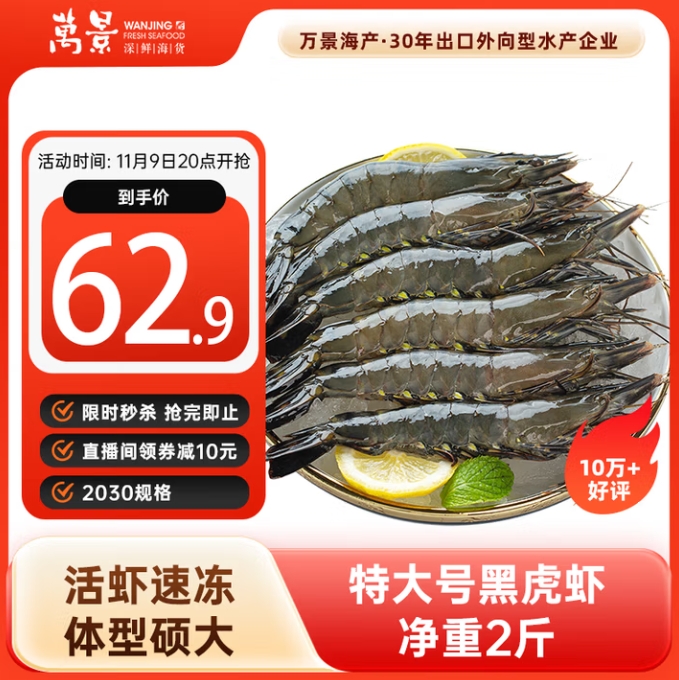 45.7元!万景 精选单冻黑虎虾 巨无霸20-30只/净重1kg