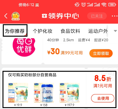 京东App-领券中心-为你推荐-下拉领奶粉部分8.5折优惠券