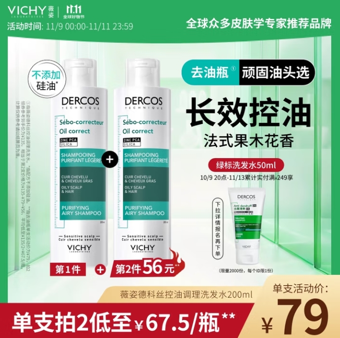 43.8元!薇姿 DERCOS去油瓶控油蓬松洗发水200ml