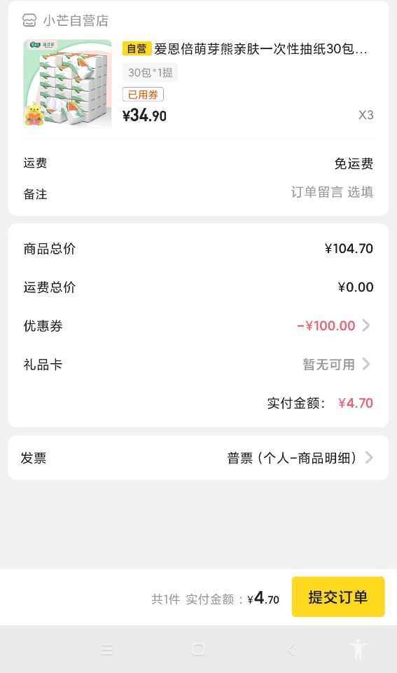 领取优惠券后!速度点击优惠券去使用,然后搜索【爱恩倍纸巾】出来的是30包一提,售价34.9元,下单三件,到手实付4.7元