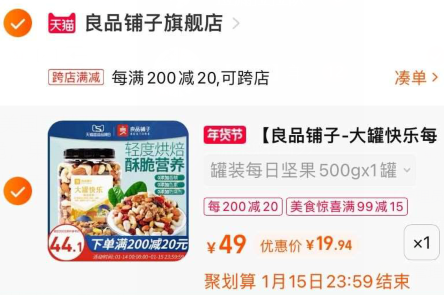 在售价49元,领16元券,叠加2个凑单,叠加99-10元聚划算券(手淘聚划算-自动弹99-10元红包)和99-15美食券,叠加跨店200-20元,叠加88VIP95折和首单礼金一起支付,实付127.65元包邮,折主商品良品铺子20元。