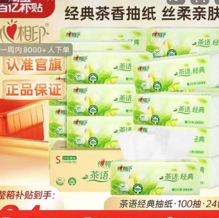 鼻炎党必囤!心相印茶语抽纸 24 包仅 23.9 元