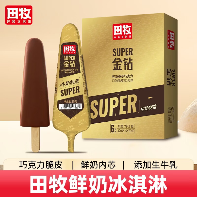 田牧鲜奶冰淇淋清仓:MINI金钻+花脸共30支,到手仅69元