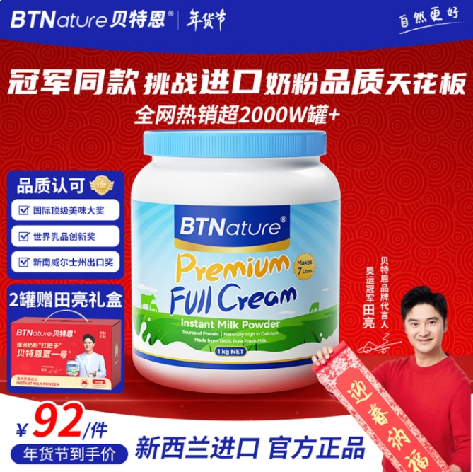 51.5元!BTNature 全脂成人奶粉 1kg/罐