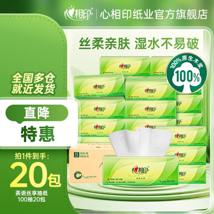 59.7元包邮!心相印 茶语丝享抽纸3层 100抽*20包*3件