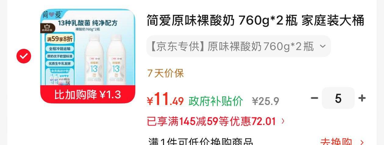 简爱原味裸酸奶760g*2瓶,政府补贴后11.5元/件