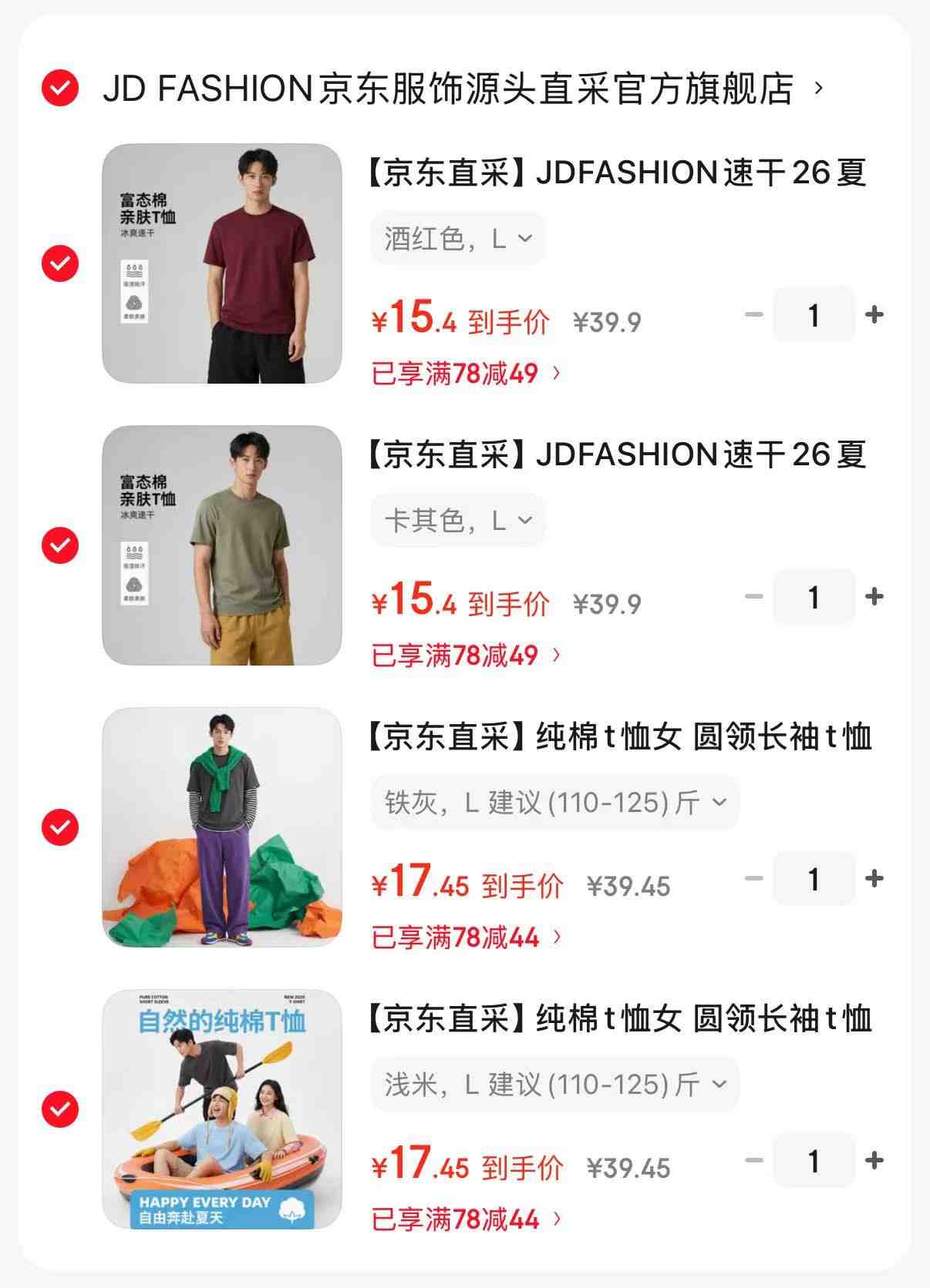 京东直采速干T恤仅需15.4元/件,任选2件到手30.8元